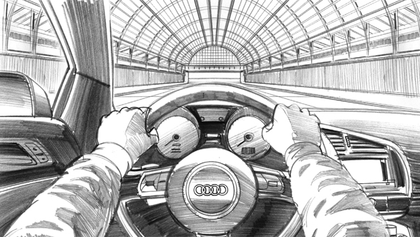 Davis Lisboa, "Audi", 2011, lápiz sobre papel | pencil on paper | Photoshop, 1476 x 831 px, DDB Barcelona, España | Spain
