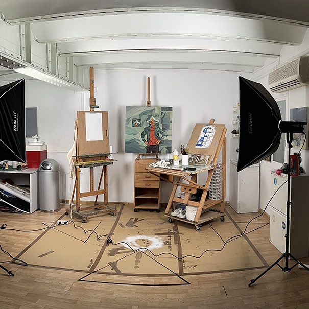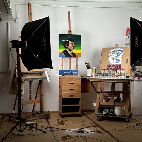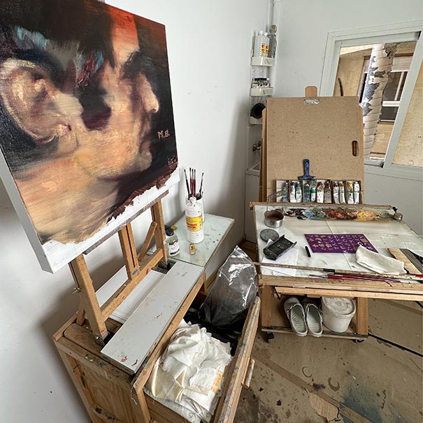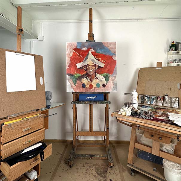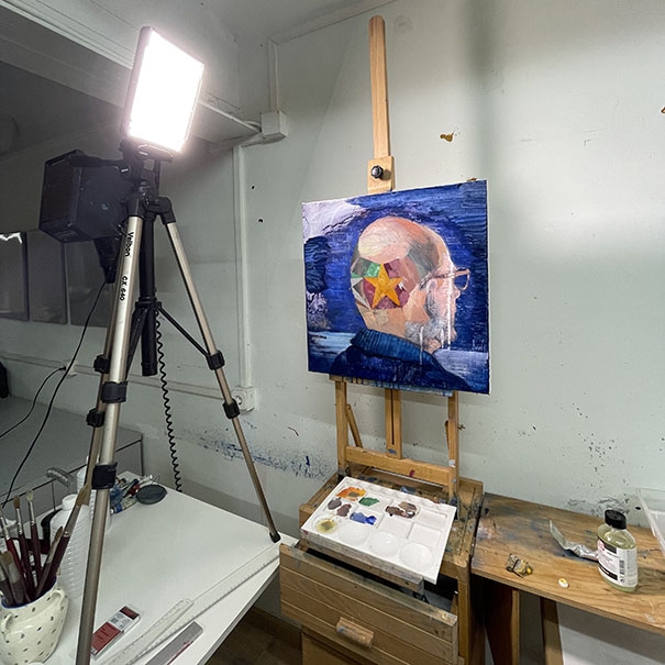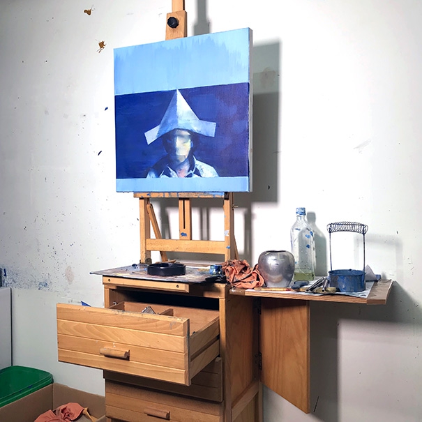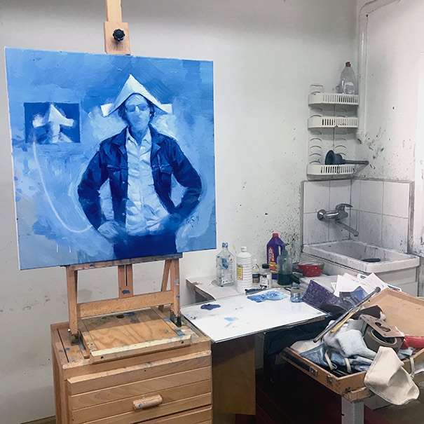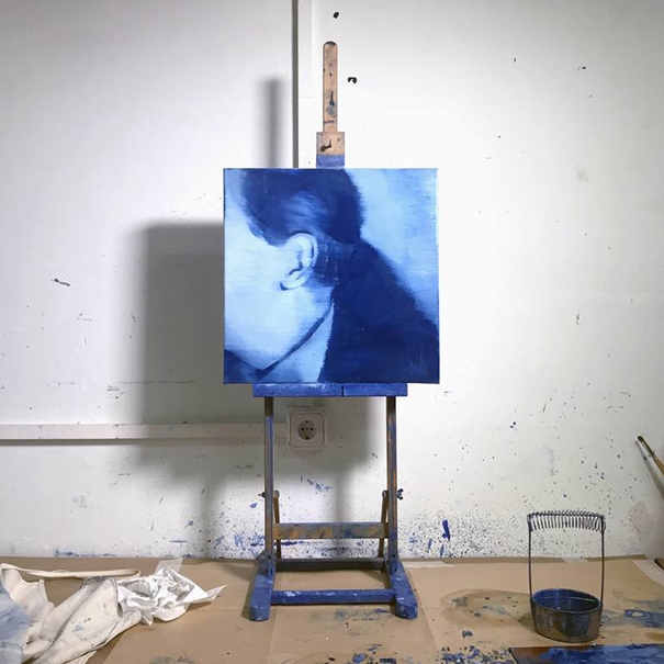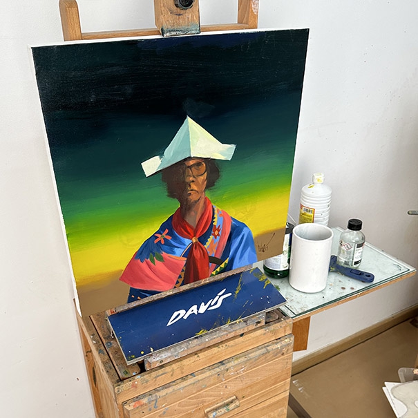 Davis Lisboa, “Self-portrait 3 (Tonsure, Marcel Duchamp)”, 2021, óleo sobre lienzo, 50 x 50 cm, | oil on canvas, 19.69 x 19.69 in