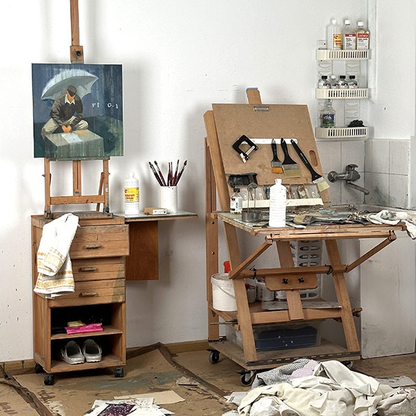 Davis Lisboa, “Musée de l'Aigle Moderne 18 (Keep Dry)”, 2024, óleo sobre lienzo, 80 x 80 cm | oil on canvas, 31.50 x 31.50 in