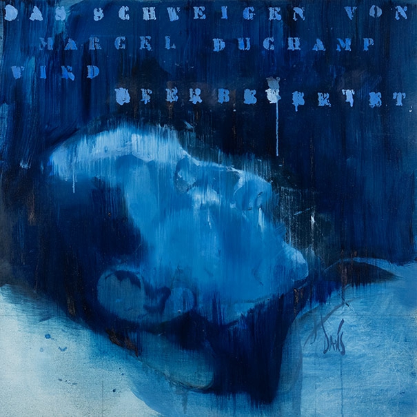Davis Lisboa, “Marcel Duchamp 18 (Das Schweigen von _ _ _ _ _ _ _ _ _ _ _ _ _ wird überbewertet)”, 2020, óleo sobre lienzo, 80 x 80 cm | oil on canvas, 31.50 x 31.50 in