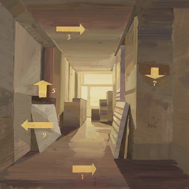 Davis Lisboa, “Musée des Aigles Modernes 7 (Les Portes)”, 2018, óleo sobre lienzo, 50 x 50 cm | oil on canvas, 19.69 x 19.69 in