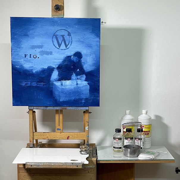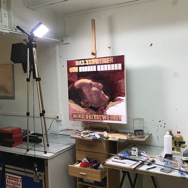 Davis Lisboa, “Marcel Duchamp 18 (Das Schweigen von _ _ _ _ _ _ _ _ _ _ _ _ _ wird überbewertet)”, 2020, óleo sobre lienzo, 80 x 80 cm | oil on canvas, 31.50 x 31.50 in